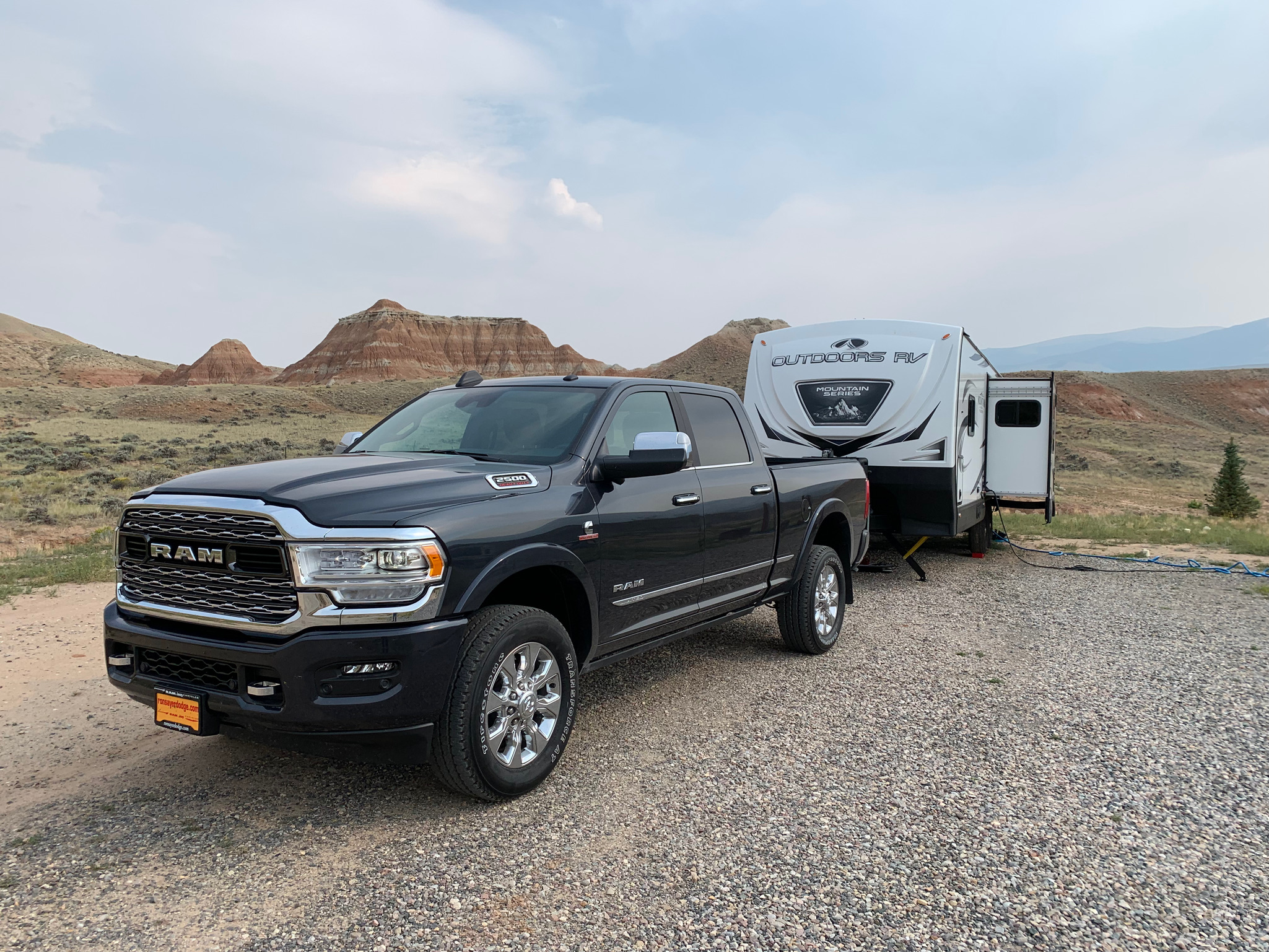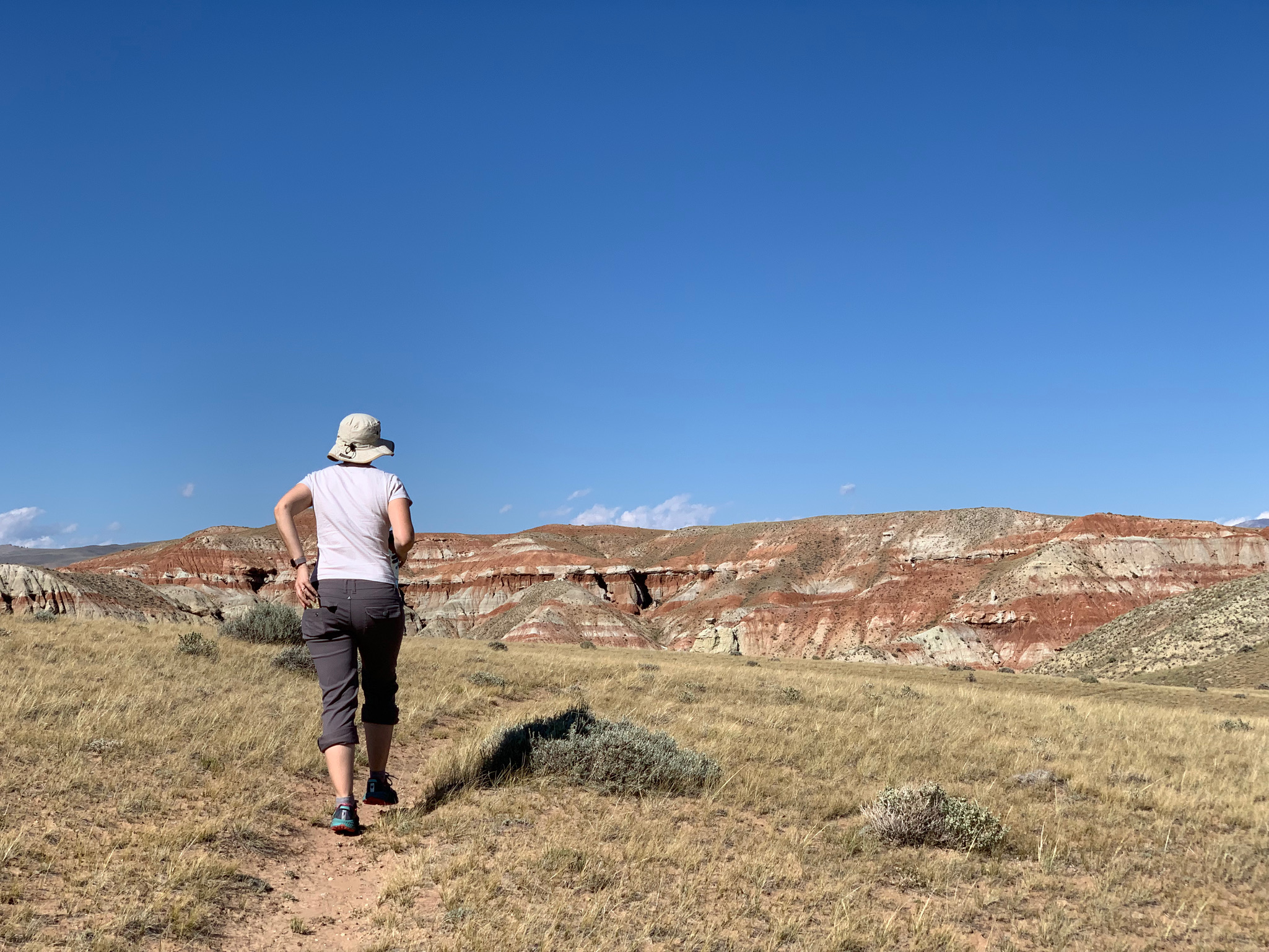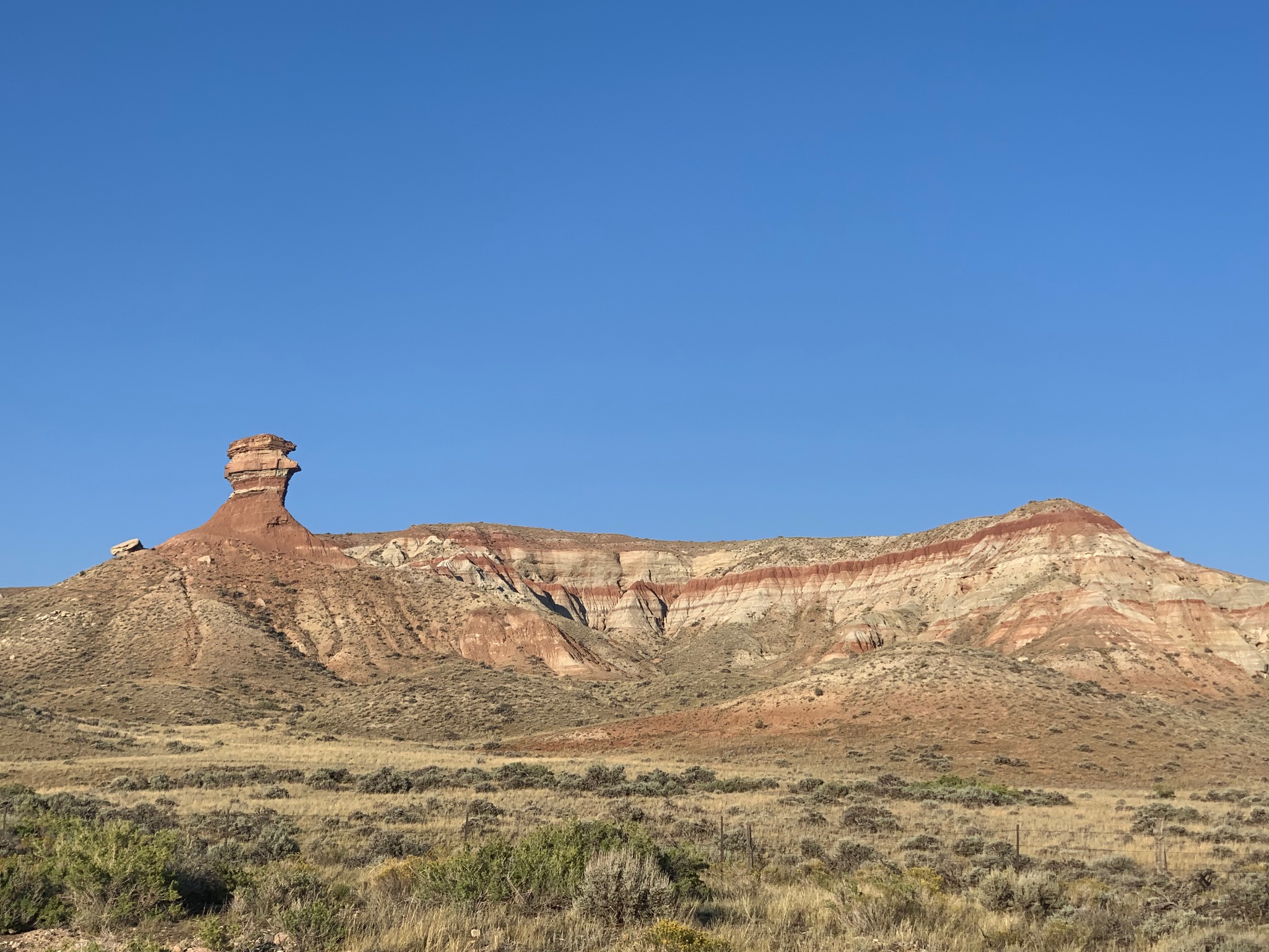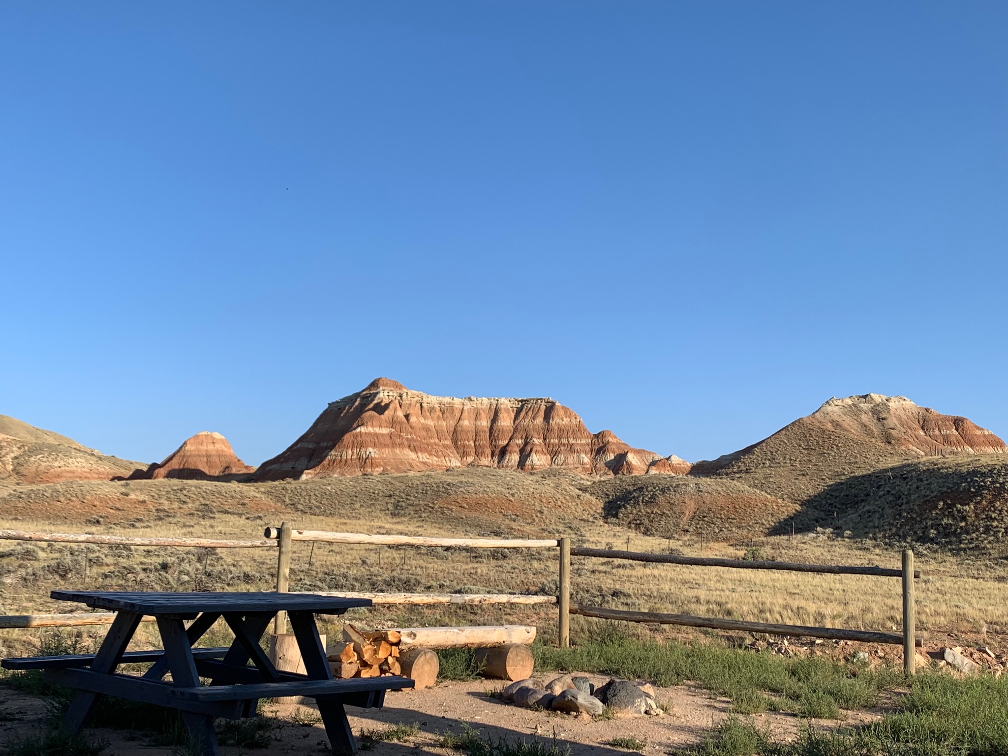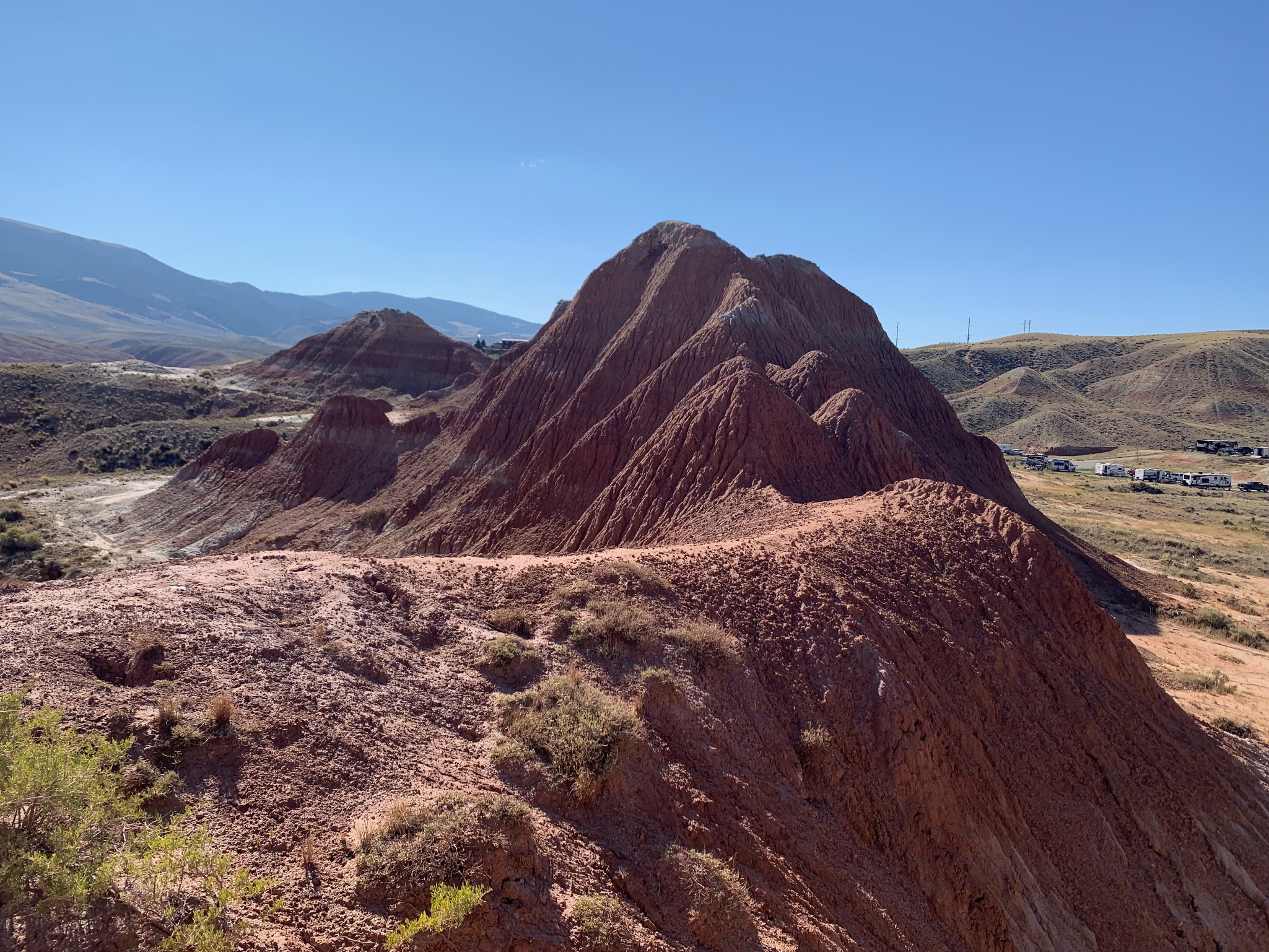 One of the best features of this park is the fact that it butts up against BLM Badlands that you can walk onto right from the RV park’s northeastern end and explore to your heart’s content. We saw lots of what we think was coyote activity when observing the skeletal remains, but it could have just as easily been a cougar, bobcat, wolf or grizzly bear. If you plod up one of the many steep hills, you get an impressive view of the area and also some pretty large gusts of wind, so again, hang onto your hat! The wind seems to pick up nearly every afternoon here, but usually dies down by the evening. Overall, I highly recommend this place if you are traveling out this way. 👍 👍