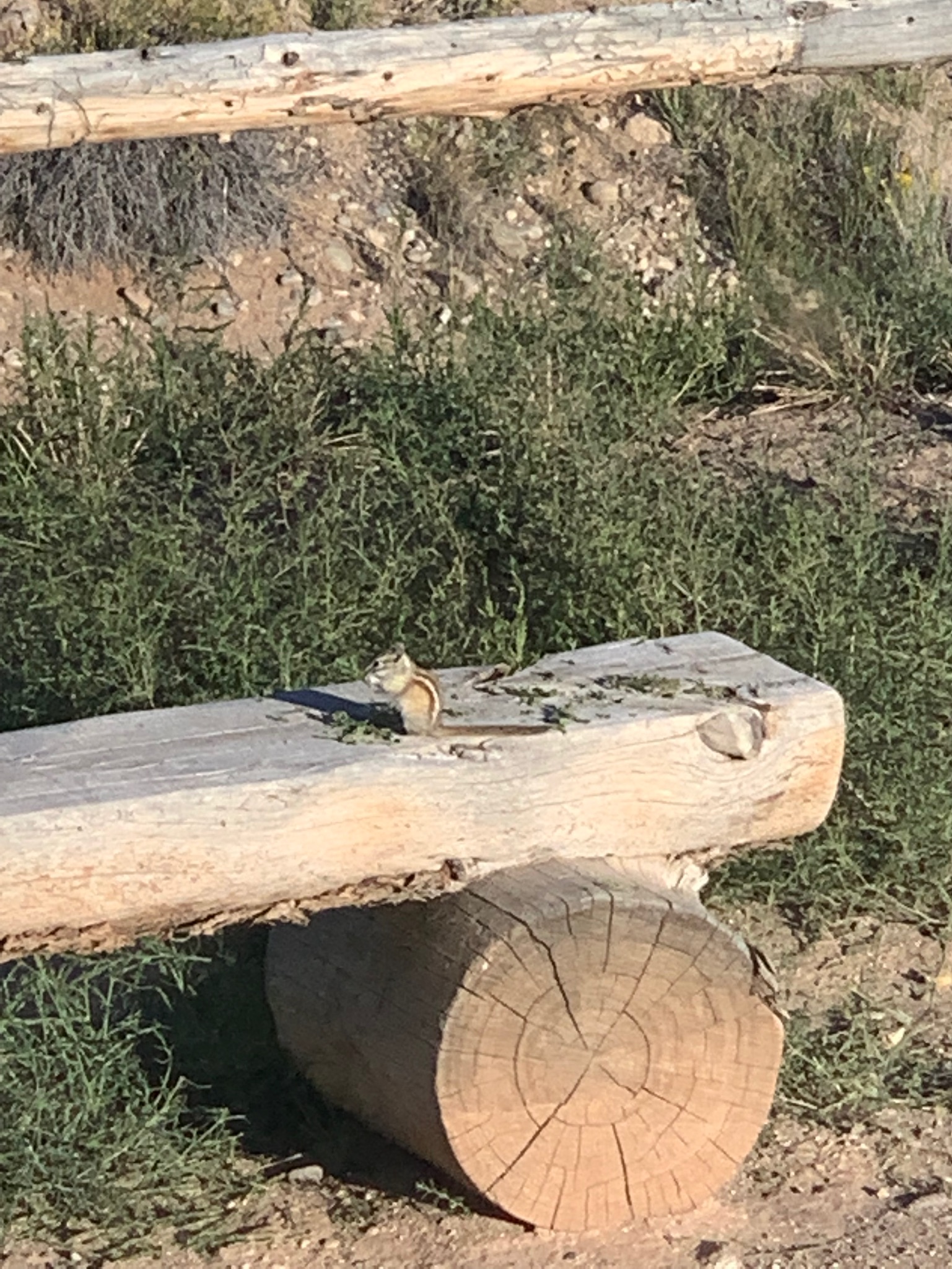 We had frequent visits from the local chipmunks, rabbits, and birds, and the site is also equipped with a picnic table, a fire ring, a bench next to the fire ring and is stocked with firewood as well. Because it has been so smoky and dry, we haven’t been allowed to have fires in most places we have traveled, and haven’t really felt the desire to. But, while looking up at the starry skies one clear and cool evening, and knowing the Dubois area had been getting rain, we felt it was the perfect night for a campfire. We also heard some coyotes calling off in the distance. Later on, we had our neighbors over for a fireside chat as well with their adorable dog Willow, who would frequently swing by and visit us while we were here. 😍
