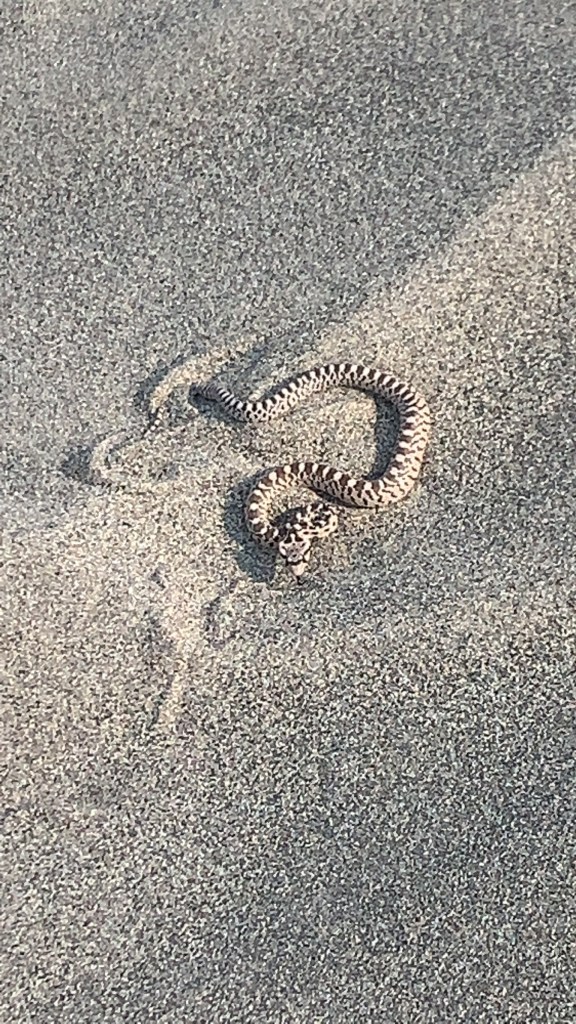 The last dune took us about a 30 minutes to ascend, and we were greeted by a gopher snake at the top. I am very curious why a snake would climb all the way to the top of a dune…to catch a meal along the way? Or perhaps snakes enjoy sliding down the dunes as well? I know it’s likely not the latter, but let me anthropomorphize the snake and think what I want. 😛 After ogling the snake for a while, we decided it deserved to be left in peace, given it put all that effort into getting up there, so we parted ways and prepared for the ultimate dune slide!
