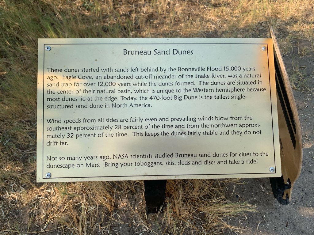 We have had a fairly mellow visit here at the Bruneau Dunes State Park. The weather has been hot, there is hardly any shade to be found, and scant wifi, so we have felt a little like being on a deserted island. However, we have found some ways to entertain ourselves while here, including sliding down some big dunes! 😃 And, there is a star observatory nearby (albeit closed to the public right now), so on a clear night stargazing can be quite spectacular.