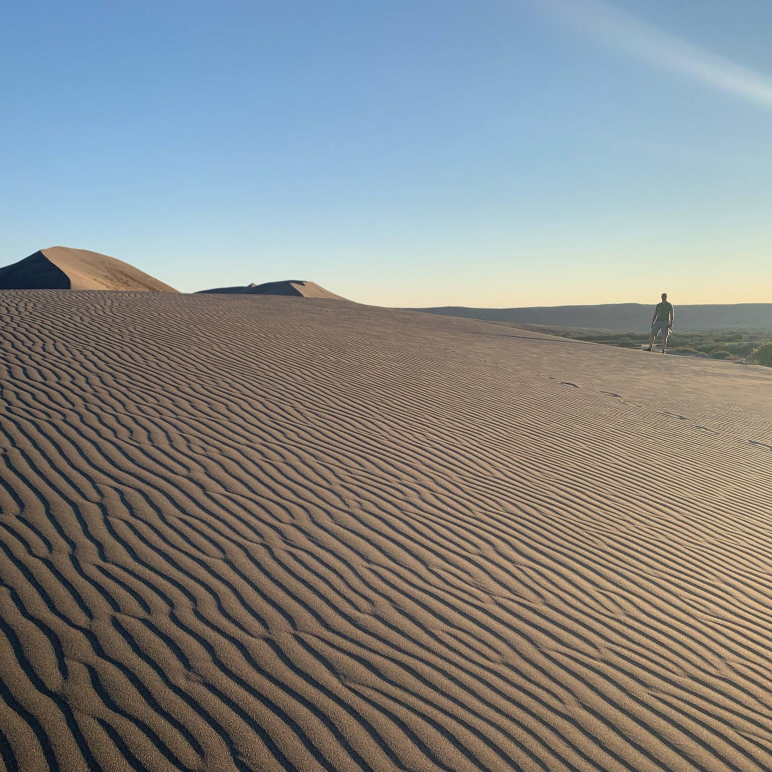 Because the dune was so steep compared to the other two, you may notice in the videos that we snow plowed our way down the first leg. 🤣 And yes, we had sand in pretty much every orifice and it covered every inch of our bodies. There is no escaping the sand! You must become one with the sand!. 🧘🏻 Anyway, we re-waxed the boards and tried to descend in another section of the dune, but it was pretty slow-going. After a few attempts, we resigned ourselves to walking the rest of the way down.