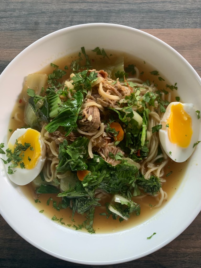 I saved 3/4 pound of carnitas and the broth from the instant pot, skimming the hardened fat off the top before mixing it with chicken stock. I started with this base recipe for pork ramen, and added 2 baby bok choy, 1 large carrot, 1 tablespoon ginger paste, 2 tablespoons soy sauce, 2 pinches of crushed red pepper in lieu of sriracha, and substituted chives for green onion since I already had chives that needed to be used. I had noodles left over from another recipe and added them until I reached our preferred level of starch. You can also use instant ramen and toss the spice packet. Finally, I garnished the ramen with soft boiled eggs and cilantro. The stock base from the instant pot added that umami taste you search for when eating a delicious ramen, so the broth required no additional seasoning. This recipe with my modifications was a success, so give it a try if you are going from taco Tuesday to a cold front and want something to to warm you from the inside out.