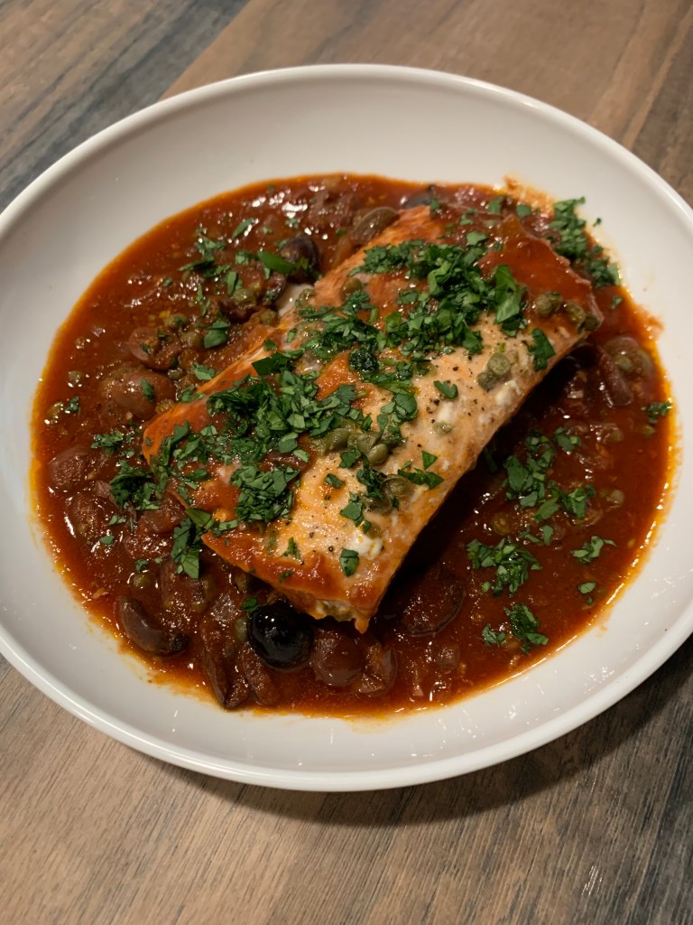 Another cookbook Matt bought me for Christmas is The Weeknight Mediterranean Kitchen by Samantha Ferraro. My favorite part about this book are the one pot dishes, which are all delicious and easy to put together. The very first meal we made in our travel trailer back in April was salmon puttanesca from this publication. It is now one of Matt’s favorites, is quick and easy if you have the key ingredients, which I always keep on hand: tomato sauce, Kalamata olives, anchovies, and capers. The only modification I make is adding the entire can of tomato sauce instead of tossing 1/3 of it. Extra sauce never hurt anyone. We purchased the salmon in Columbia Falls at the Flathead Fish & Seafood market and this was a perfect use for it. It’s bursting with flavor, tangy and tart, and complements the salmon well.