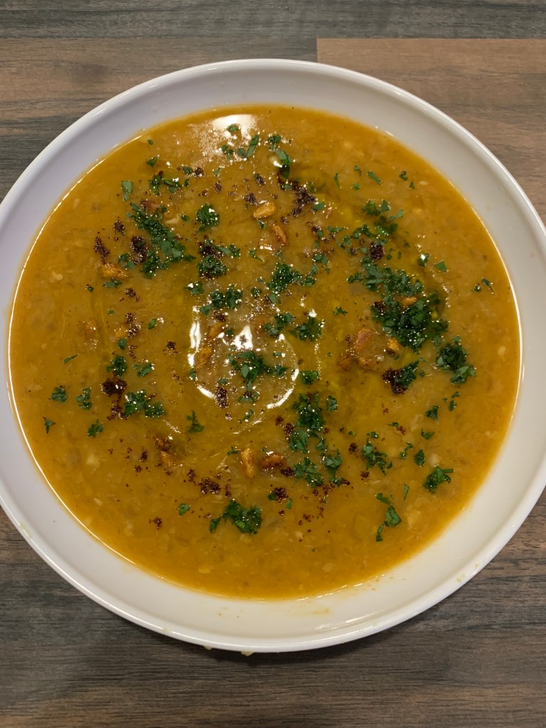 To garnish, I toasted some pine nuts with paprika and cumin, then added this on top with a little swig of olive oil and some cilantro…not altogether that different a garnish than the red lentil soup, which has a similar flavor profile but a different texture. You can’t go wrong with either one.