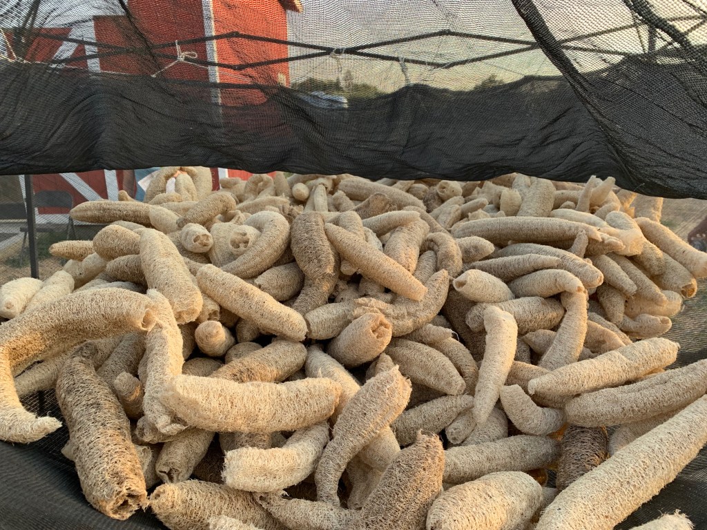 We learned quite a bit on the farm tour. Did you know that loofah comes from a gourd that is also known as Chinese okra or elephant okra and several other names? 😲 It grows on a vine, and once it reaches maturity, it dries out within in a week and turns brown. At that time, you can harvest them, shake out the seeds for replanting the following year, and peel off the outer shell. Inside, there is still a film on the fibrous spongelike material you know as loofah, which gets washed away in a large, rotating drum and the washed sponges are then dried in the sun for your use in the shower, the kitchen, as a chew toy for your dog’s dental health, and more.