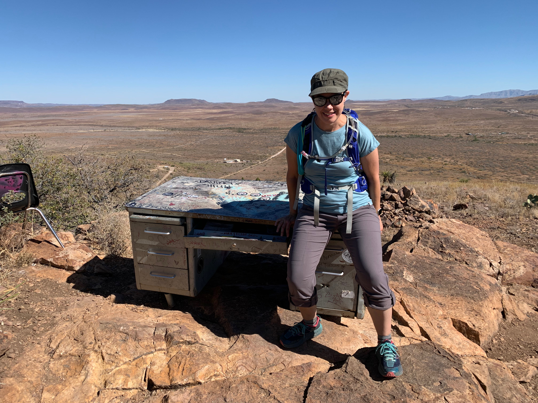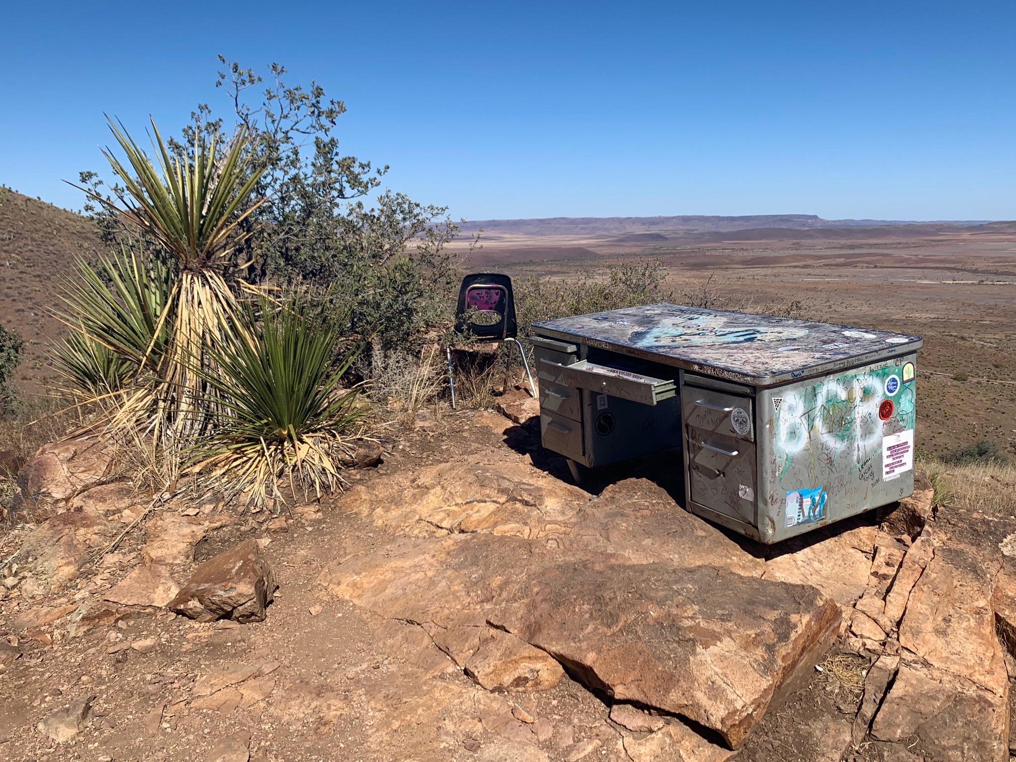 The day after we arrived in Alpine, we went for a hike up Hancock Hill, situated behind the Sul Ross State University student housing. This is a popular local hike that gives you great views of the surrounding areas, and if you download a map, you can also find a bike tree and a desk up there. Here is a nice write-up about the desk’s history, which I highly recommend reading. We also saw lots of budding cacti and some interesting grasshoppers. It is not shaded at all, quite rocky and lots of pokey things protrude into the trail, so wear sunscreen, long pants and bring plenty of water. We had fun nonetheless and liked that the other hikers on the trail were really friendly as we passed by.