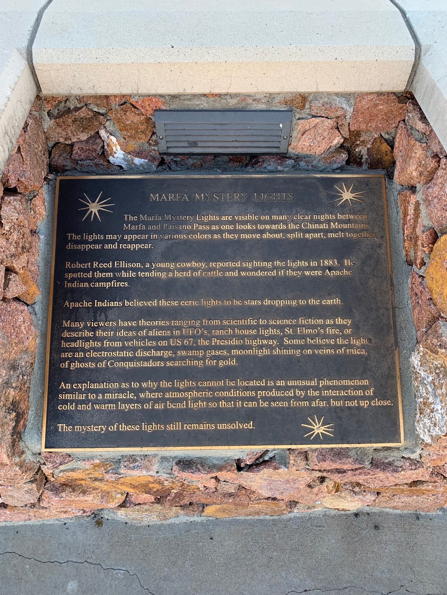 Finally, most people will tell you that a visit to Marfa is not complete without seeing the Marfa Lights after sunset. There is a roadside pavilion where you can view the lights for free, so we drove up on a Saturday night to see what all the fuss was about. After observing for about half an hour, we saw red and white lights that would appear and disappear. Matt looked at a map of the area, and after watching the lights disappear and reappear, we determined that they were all in a straight line, which seemed to lend itself to the theory that they are just car lights and nothing that unusual. Is this the case? Come see for yourself if you are traveling through, and decide for yourself. We won’t spoil it for you. 😊