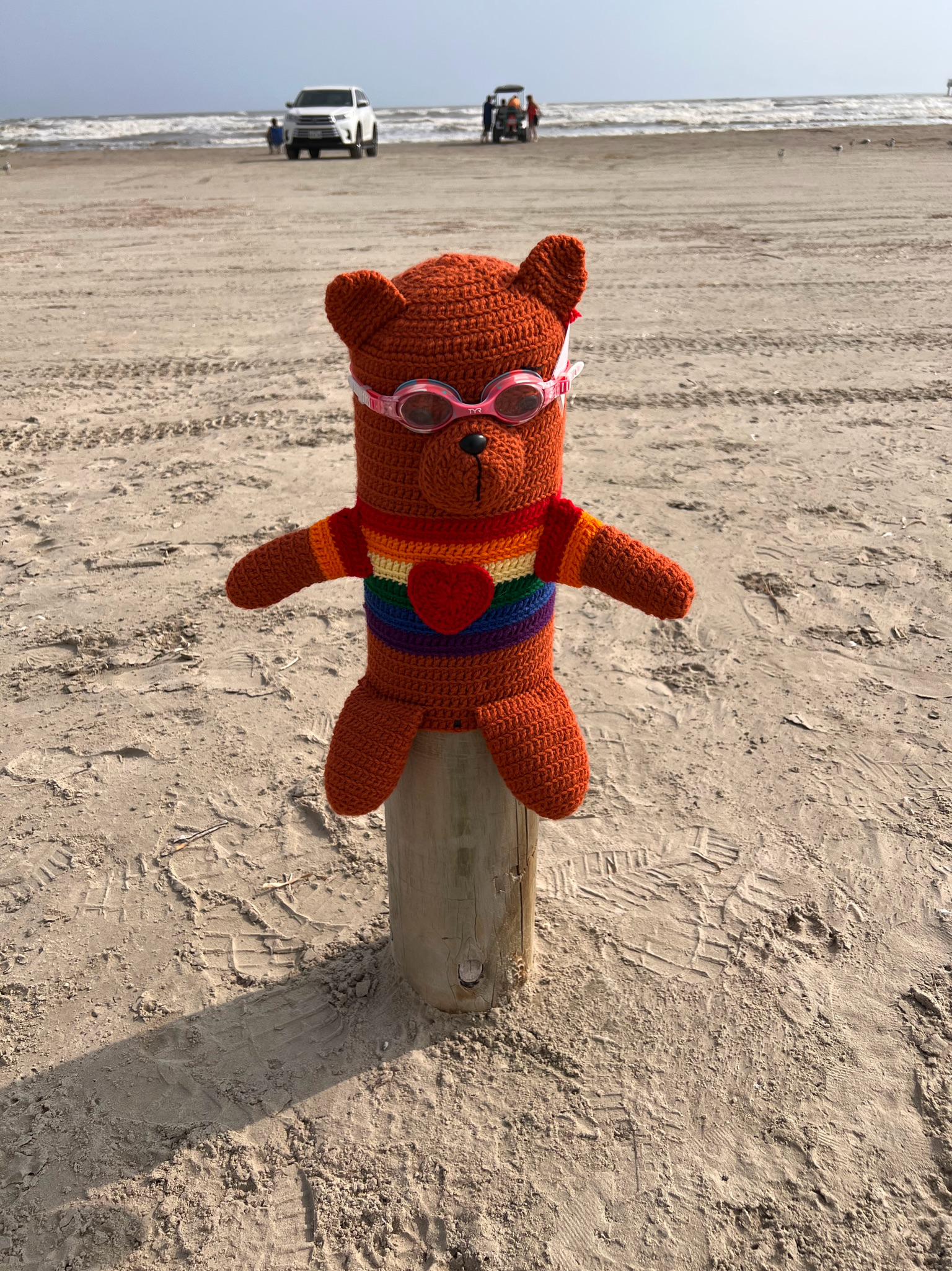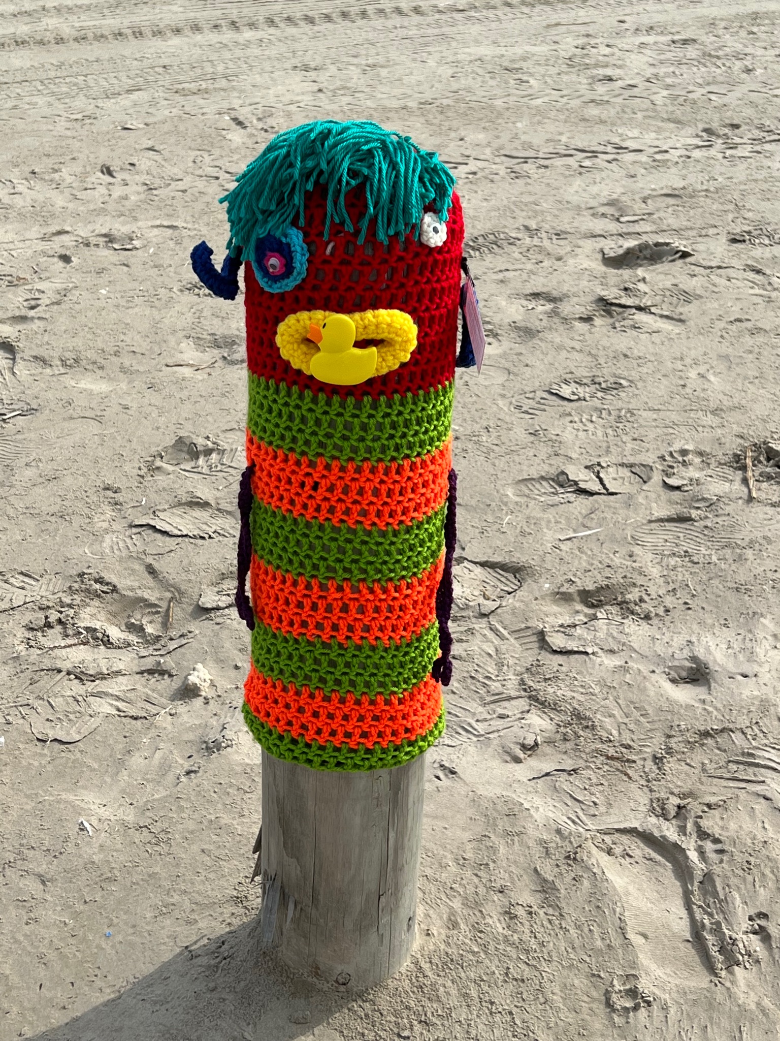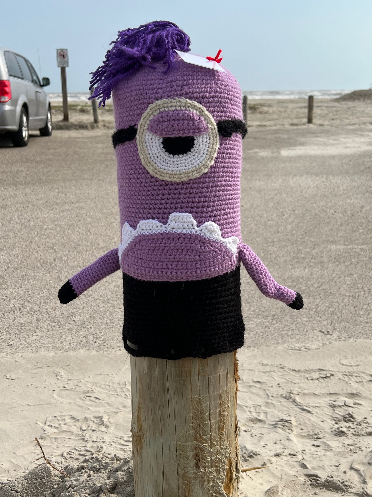 A resident of Port Aransas was tired of looking at the ugly bollards that lined the beach, so she decided to dress them up with crocheted and knit “bollard buddies.” Other people started pitching in, making it an annual tradition by a group that calls themselves the Yarn Bombing and Bollard Buddies of Port A. Here is another article, chronicling a little background on this creative group. They take all of the creations down before spring break so they aren’t destroyed, so we were there at the right time of year to enjoy these crafty displays of art.