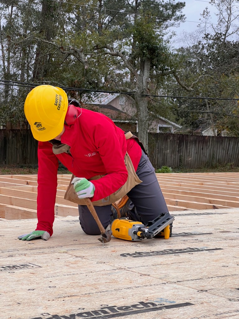 It’s now Tuesday, and we started with cleanup before getting to work on the rooftop again. It rained over the weekend, so we had a bunch of water in the house that needed to be swept out. Once this task was done, I worked with our Care-A Vanner team leader Darrell to start putting OSB on the more complicated part of the rooftop in the front of the house. This involved more nailing and running around the rooftop in a harness. It took a lot longer to cover a smaller section, because we needed to make sure our trusses were set the right length apart and the two pitches in the roof would come together correctly at their respective peaks. This was our last build day on this site.
