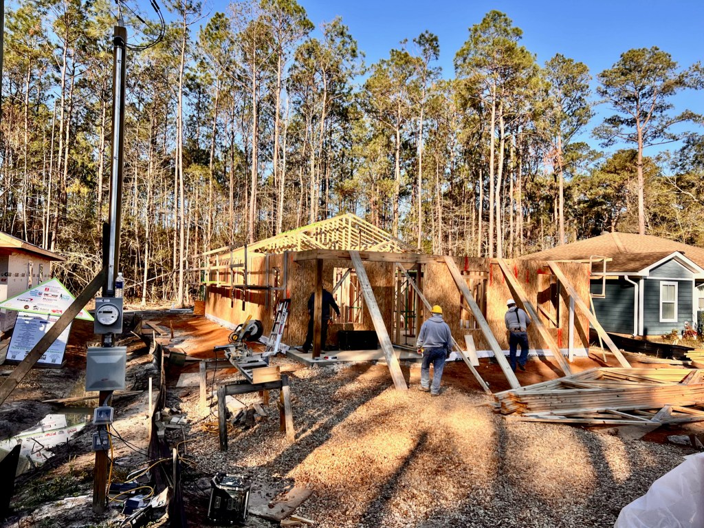This day started out 20 degrees cooler after another night of rain, and it was only going to get colder as the day went on. 🥶 We had two choices: go to 5th Street and work inside one of the more finished houses putting up OSB on some of the inner walls, or go to H Street and continue working on the floor of that house.