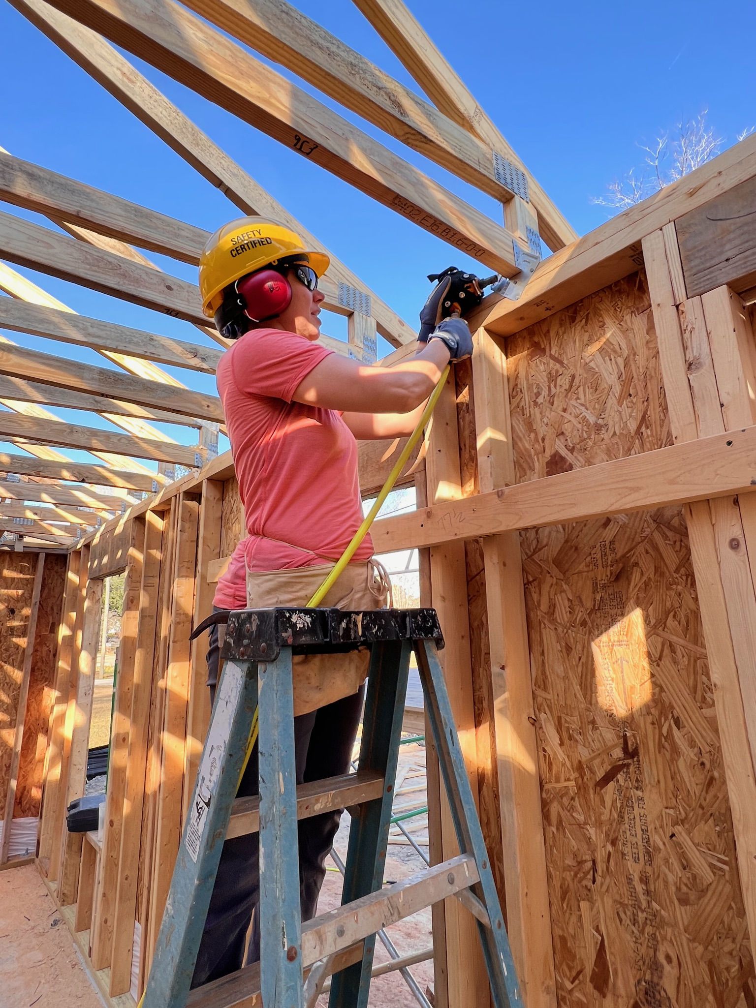 Once we had everything secured, we started sending up trusses for the roof and setting them in place. We got about a third of the way through the trusses before we called it a day. I became more comfortable with using an impact driver to put in screws for the supports and later cut some boards on the miter saw. I was excited about learning these handy skills!