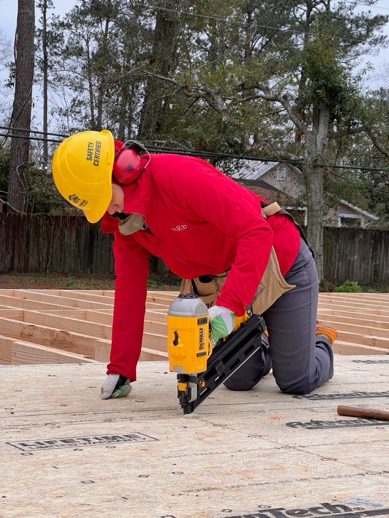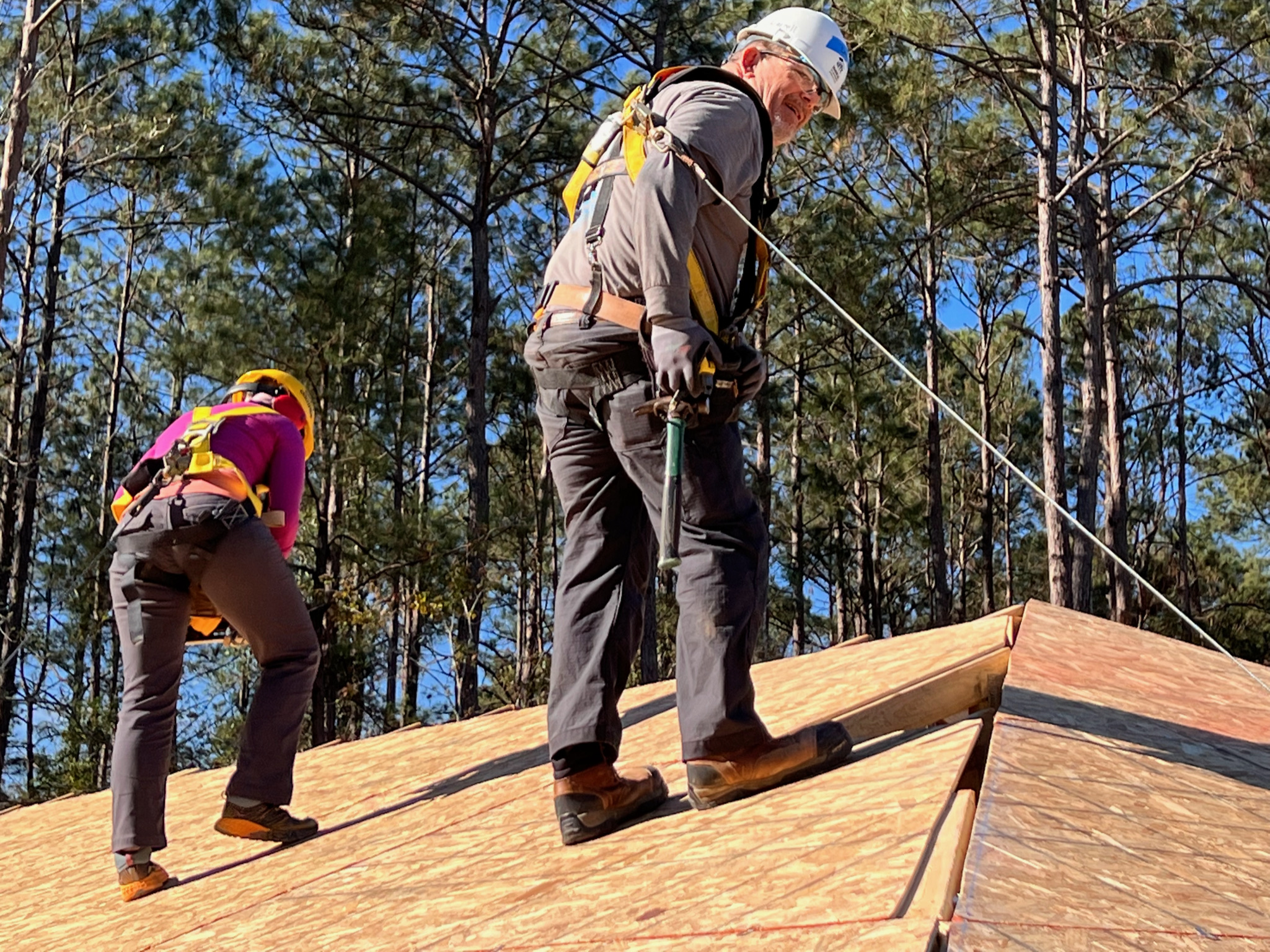 After the first row of OSB was set, Matt and I were put into harnesses, which were attached to “yo-yo’s.” These yo-yo’s have a 25 foot cable inside and the other end is attached to a metal bracket that was screwed into the rafters on the roof. Now we had a safe way to walk on the roof, and if we were to fall, the yo-yo would stop the cable from unraveling further and prevent us from sustaining a large fall. Believe it or not, I am afraid of heights, so having the harness made me feel a lot better about walking on the roof. 😬