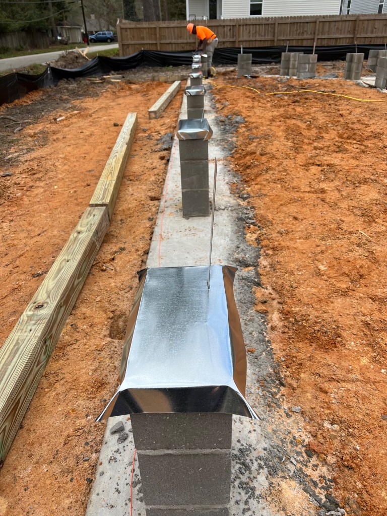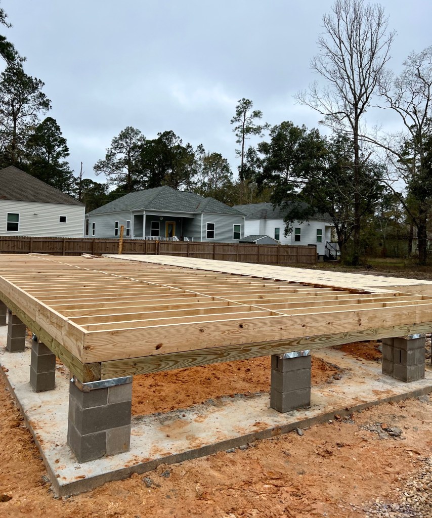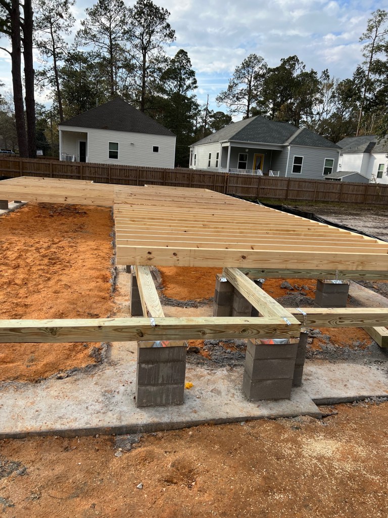 Once the posts were set in place, the crew secured the posts with straps that were attached to the cinder blocks. Now we could get to work on placing joists on top of the sill plate, which were made of 2×12 inch boards. These were a little bit more manageable, so I was introduced to the circular saw, and helped cut boards to the required lengths. We finished almost 2/3 of the joists before calling it a day.