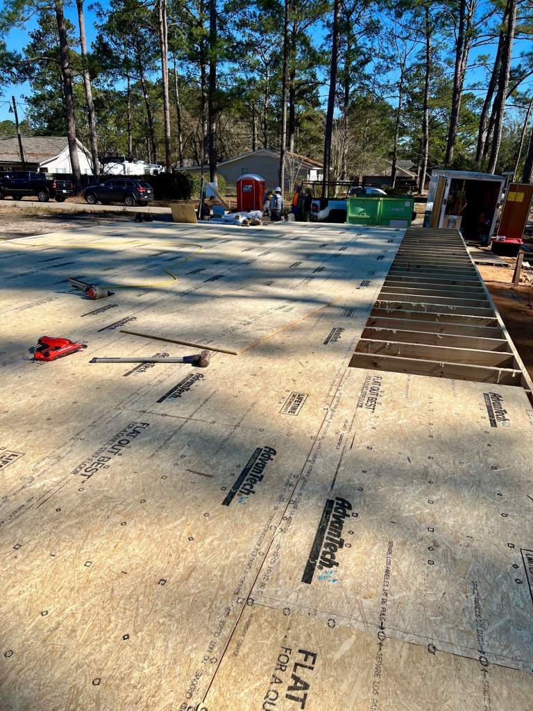 Finally, we started setting tongue and groove panels on top of the trusses, which made up the subfloor of the house. The bottom side was glued to the trusses with a subfloor adhesive and then nailed to the trusses. It was my job to finish nailing all of the subfloor once it was put into place. This may sound easy, but my nail gun kept misfiring into the harder surface, so I was constantly unjamming the gun, pulling nails and having to redo my work. 😫 At the end of the day, we were cold and tired and happy to head home to warm up.