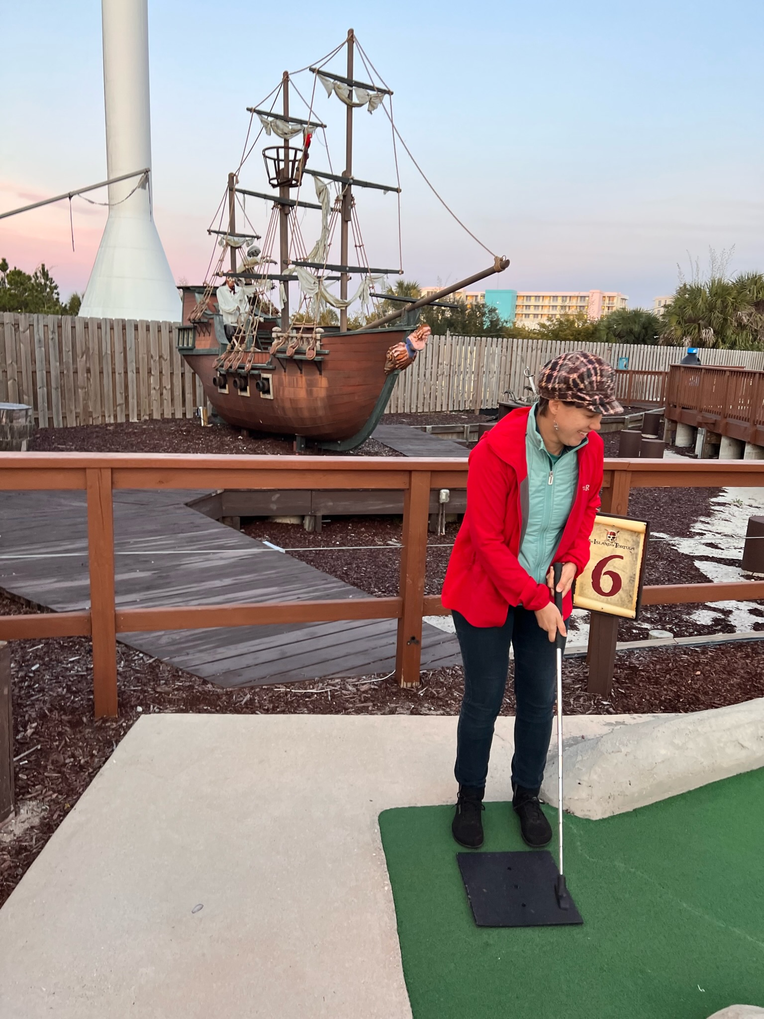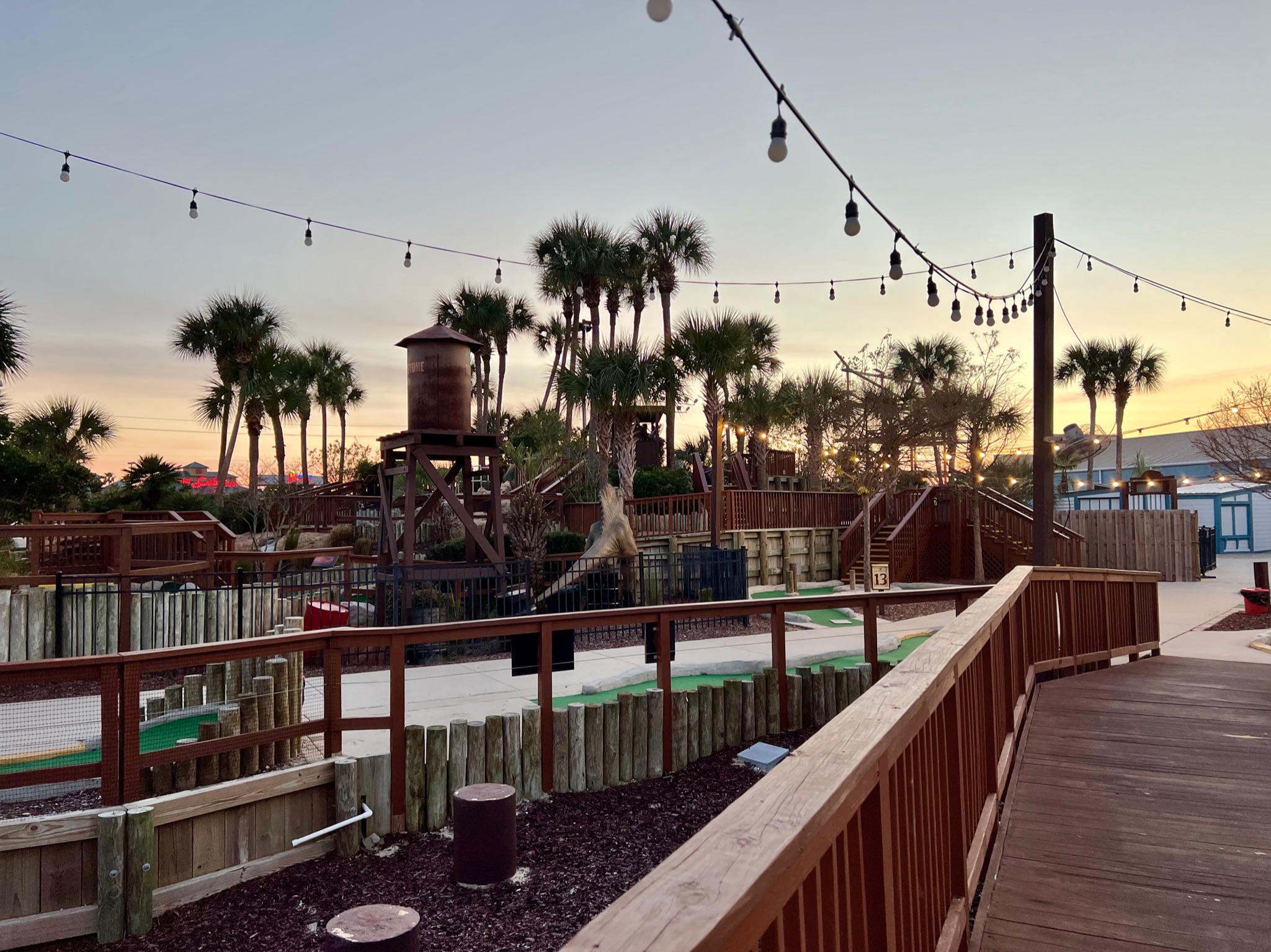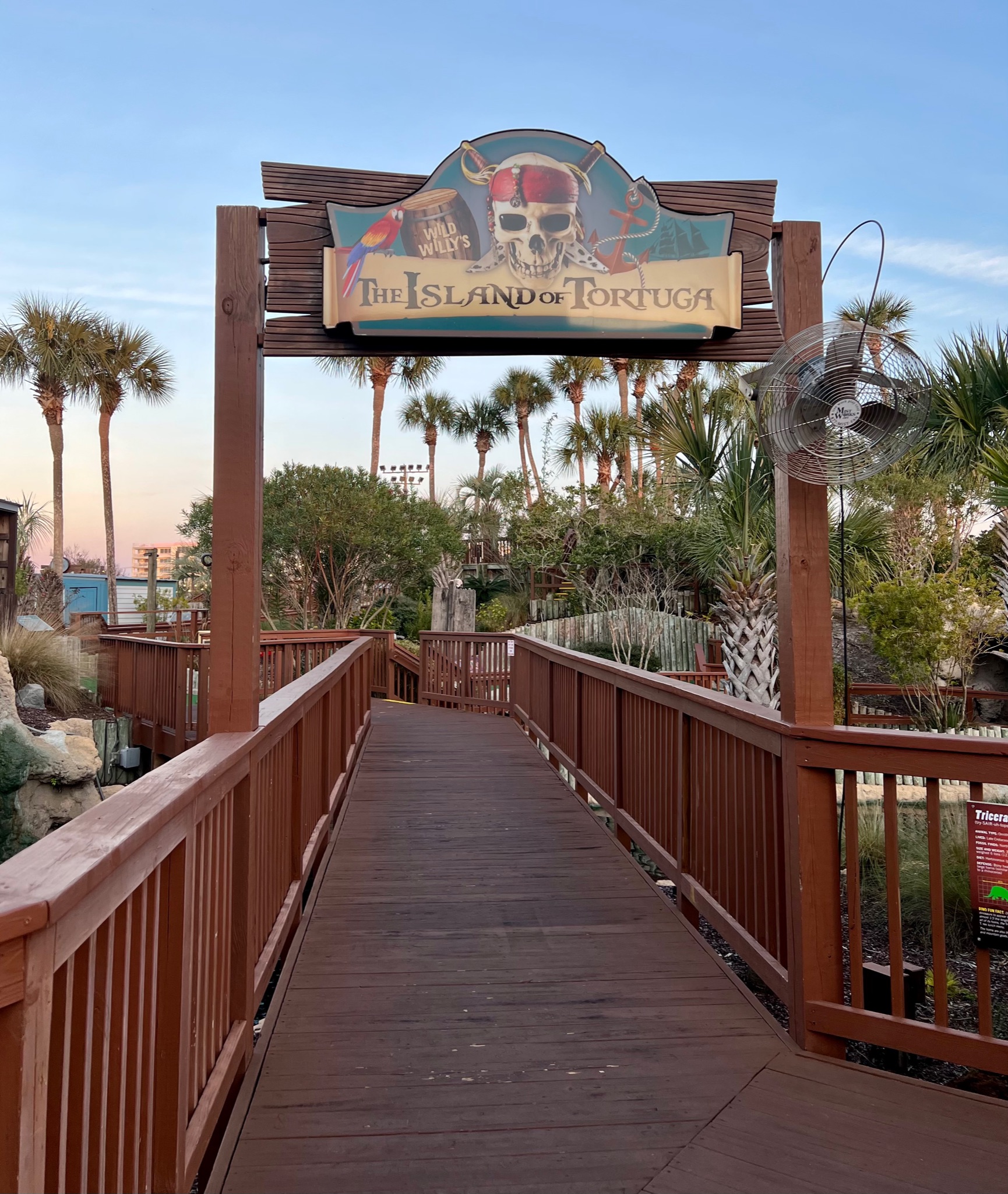 Next door to the RV park is Wild WIlly’s Adventure Zone, an arcade with mini golf and a ropes course out front.  We popped over one evening as the sun was just starting to set.  They offer two mini golf courses: the pirate-themed Islands of Tortuga or Jurassic-themed T-Rex Island.  Both are pretty cheesy, with motion sensored animatronic figures that talk and move.  However, the courses are some of the better maintained ones we have seen, so it could be a fun outing if you are staying nearby.