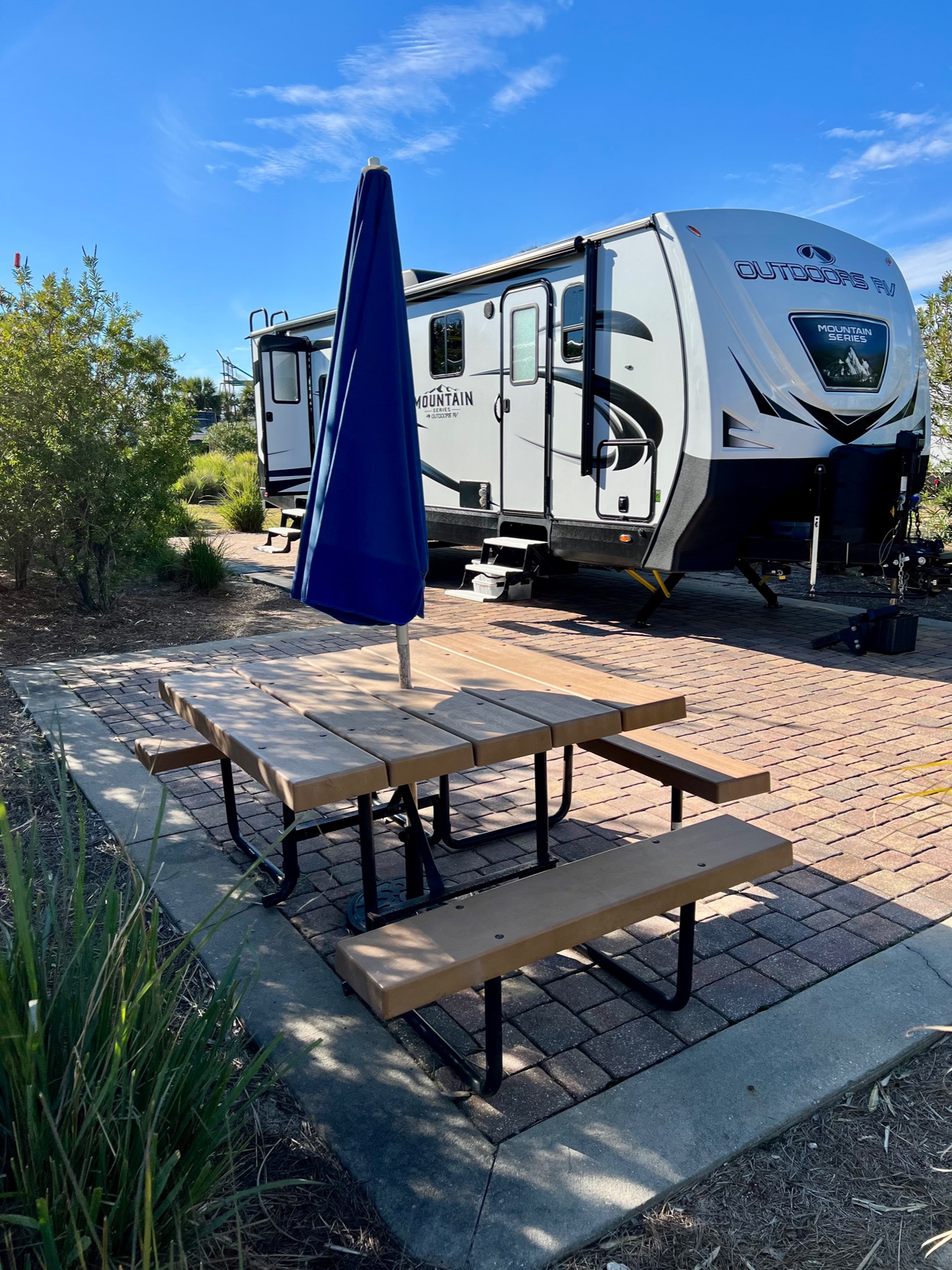 The main drag between Fort Walton and Destin is called the Miracle Strip, and our RV park was right off of it, between the road and the bay side.  The Destin West RV Resort is smaller, but clean, and conveniently located.  They have a pool, communal fire pit, showers and laundry on site, and the landscaping between sites provides a decent amount of privacy.  There are also some high top tables on the bay side where you can sit and watch the birds, boats and waves, which we did a few times.  The only issue with this location is that it’s loud and there is no escape from the traffic noise.  Otherwise, we enjoyed our stay here.