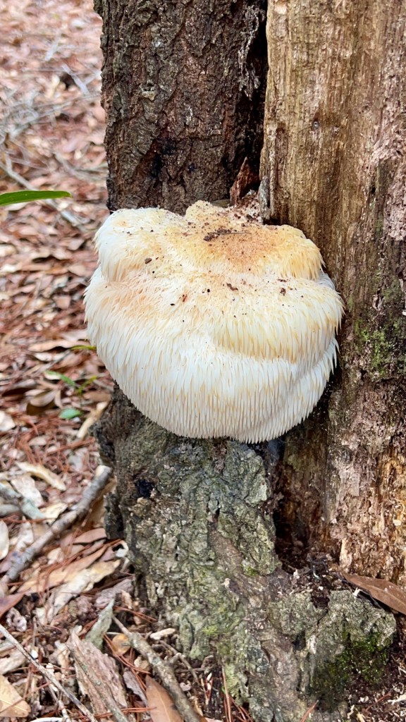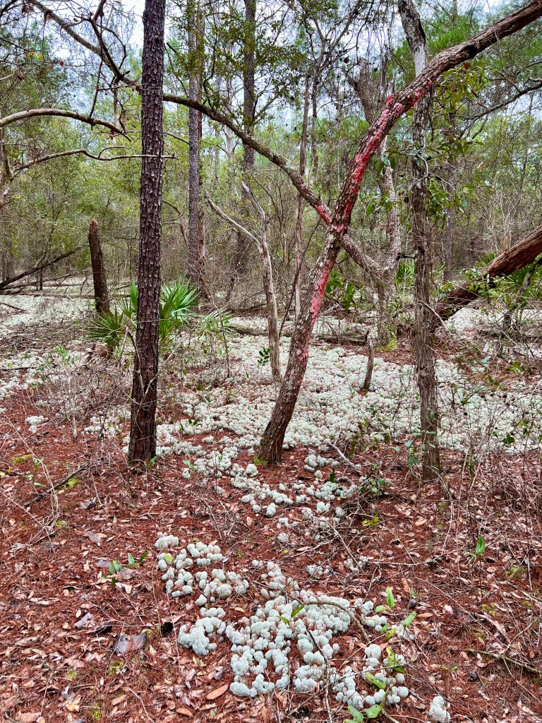 I was surprised and delighted to discover that this area was filled with a wide variety of fungi, lichen, and moss, including a lion’s-mane mushroom, Christmas lichen, and Evan’s deer moss.  The trails are primarily a combination of pine straw and firm sand, and the routes are relatively flat.  Just FYI, the air force was performing drills during the morning, so there were lots of jets taking off overhead and the faint sound of heavy artillery being used nearby.  However, the activity did subside in the afternoon and it was an otherwise peaceful hike.