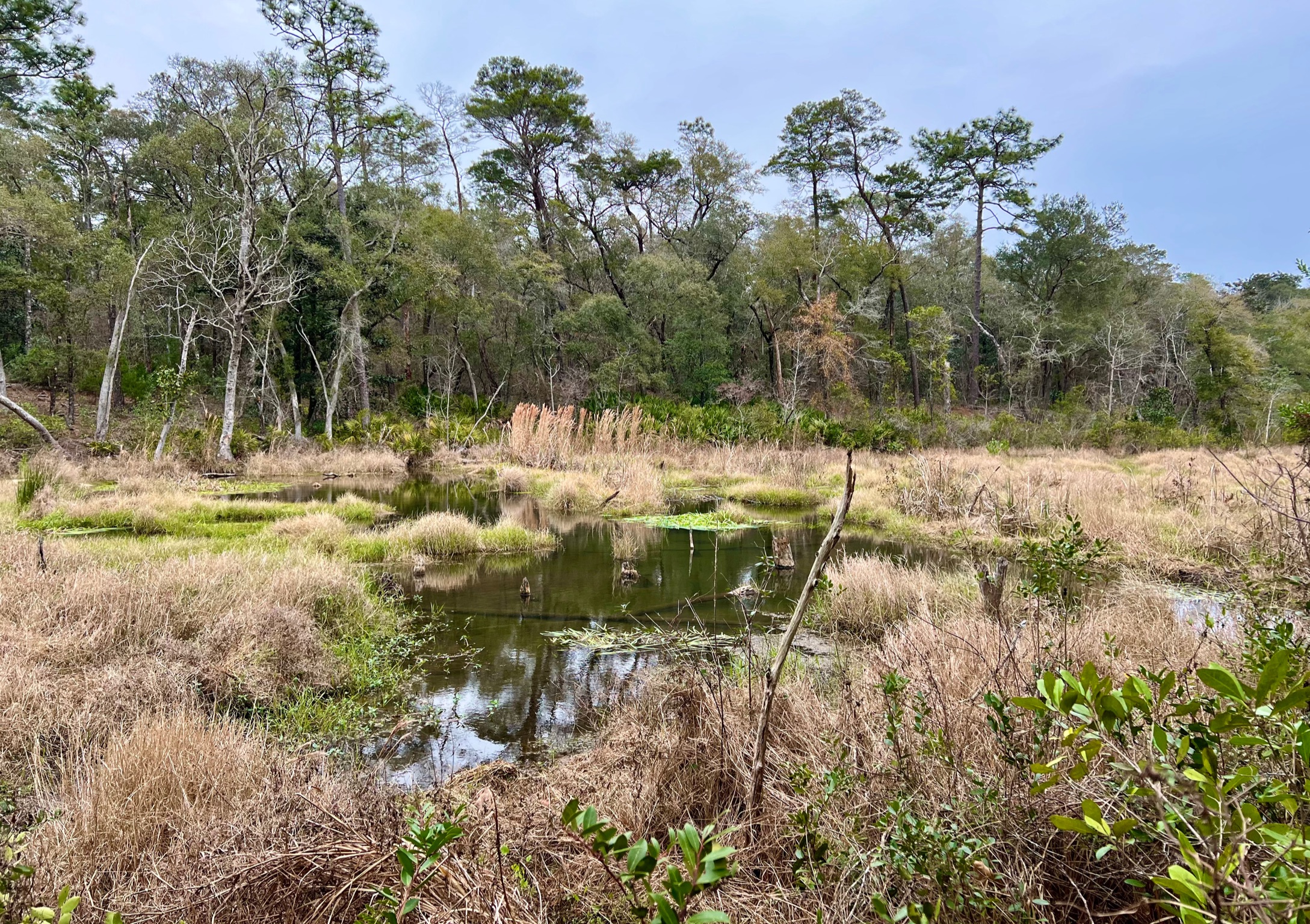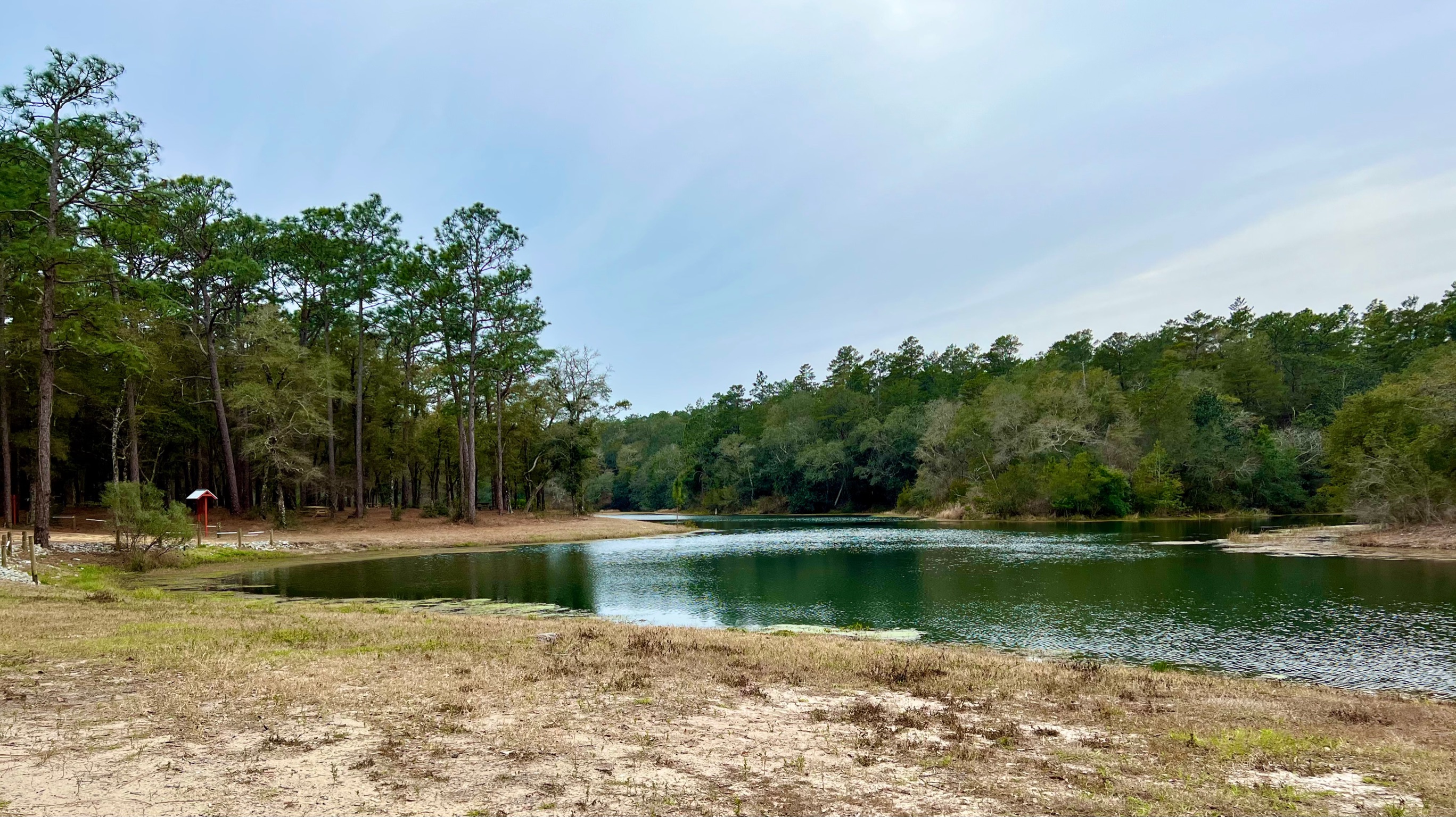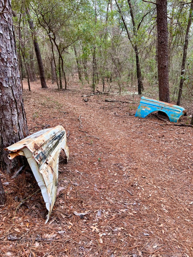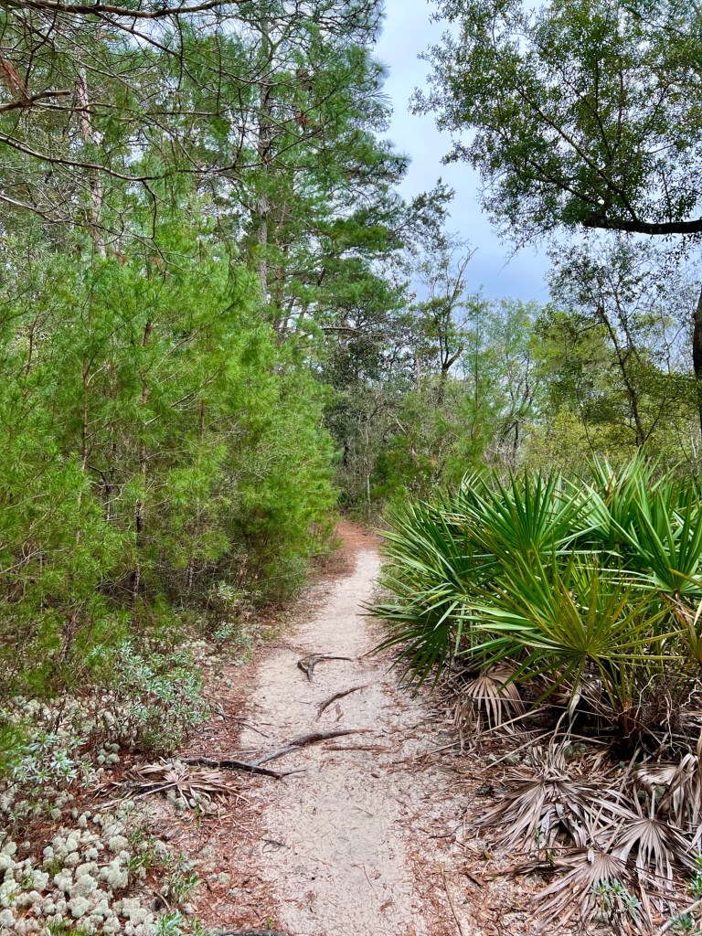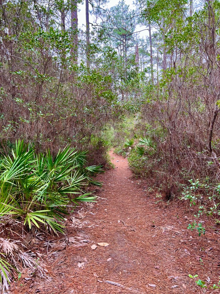 To cap off our stay, we found a nearby hike on Eglin Air Force Base, called the Timberlake Trail for hikers and cyclists.  If you look at the GPS map for this trail, it looks like some sort of tentacled sea creature or an outline of a tropical bird with its zigzag route. 🦑 However, there are more direct routes surrounding this trail as well as another trail on the other side of the Lightwood Knot Creek that you can take to Timber Lake.  The trails were well marked, our route having red markers and the more direct route having blue markers, though I suppose it might be a difficult to follow if you are color blind, so use a GPS map to stay on track. 😳