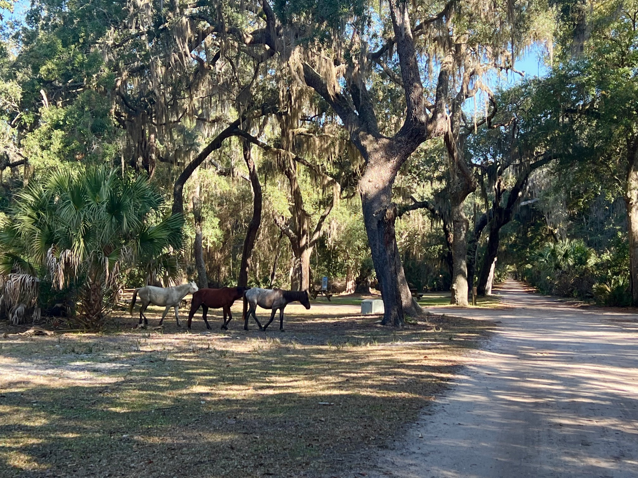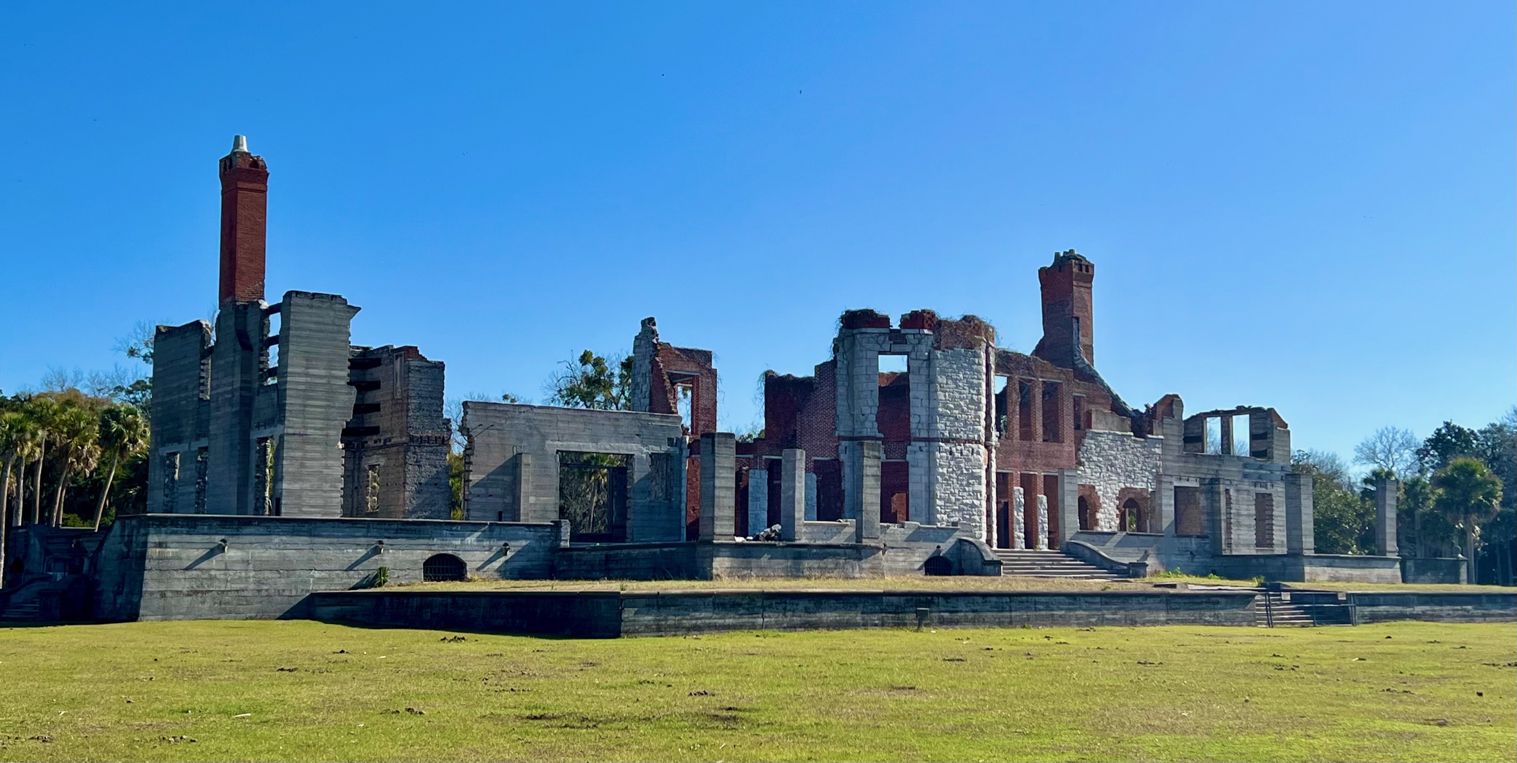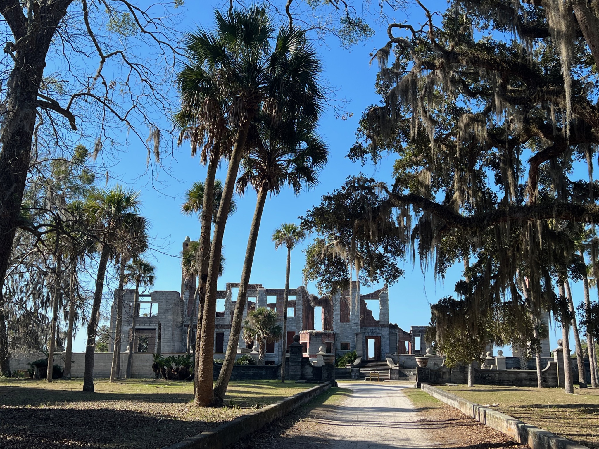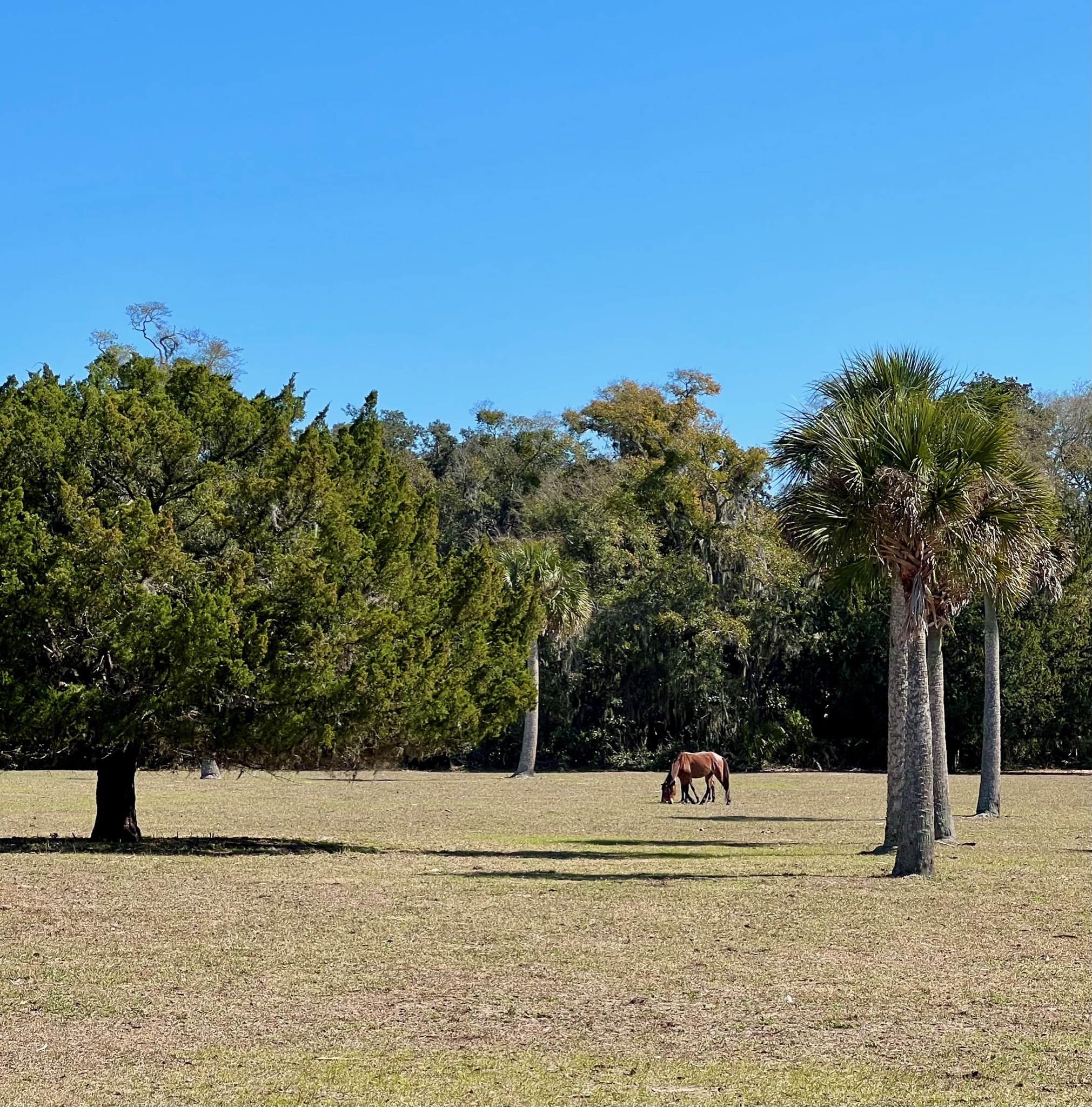 When we arrived, we headed south toward the grand Dungeness mansion ruins. We had to tread carefully, because wild horses roam the island and are known to kick, so steer clear! We saw several horses on our way to the ruins and a few were getting rambunctious, which made us nervous, but we made it unscathed. 😬 There are informational signs around the ruins explaining the history of what used to be a really grand property, and the views are quite stunning.