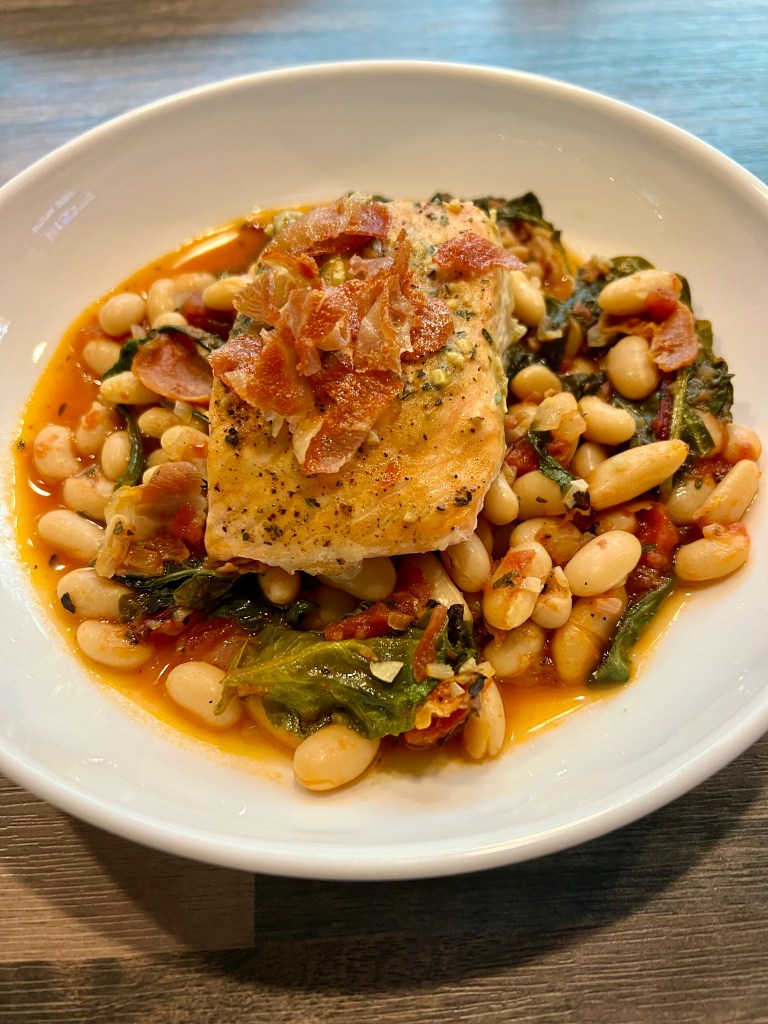 Beans and lentils are an important part of our diet, being high in folate, potassium, iron, magnesium and a great source of fiber. As such, I thought I’d try this salmon and bean ragù recipe. Using canned beans also means this meals can be done in less than 30 minutes. I chose to use 3 oz of prosciutto instead of 2 oz, crisp it up in the pan ahead of time, and then save 1/3 of the crumbled results to garnish with at the end. That little bit of crisp texture worked great in this dish. I couldn’t find escarole either, so used a mixture of dark leafy greens instead. We loved how this turned out and think you will too.