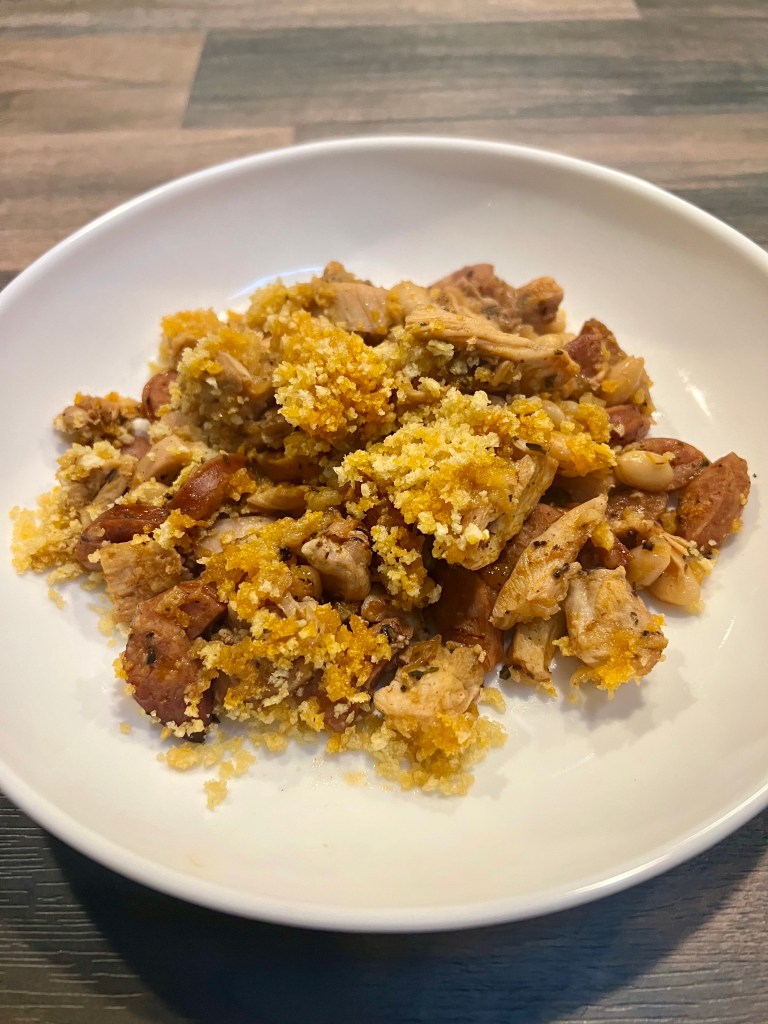 Cassoulet can be as simple or as complex as you want it to be, from curing the meat 2 days ahead, then cooking the meats and soaking beans 1 day ahead, and then assembling everything on the final day. Conversely, this simplified version of cassoulet can be done in a hour. I didn’t want to waste a lot of propane cooking for hours, so I opted for the simpler version. If you love duck like I do, I highly recommend incorporating that into this dish and allowing for any extra cooking time, but chicken thighs are also a tasty and a very forgiving meat that can easily stay juicy and tender. I had a couple of Andouille sausages left over from another recipe that also worked well in this dish, and two cans of northern beans.