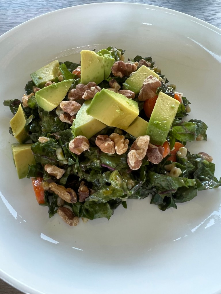 To plate, I added half a perfectly ripe California avocado to each and sprinkled some toasted walnuts on top. The recipe doesn’t call for walnuts, but I had them on hand, and they add a bit more crunch to the dish. This was a wonderful salad bursting with flavor, packed with nutrients, and it satisfied our hunger. 😋